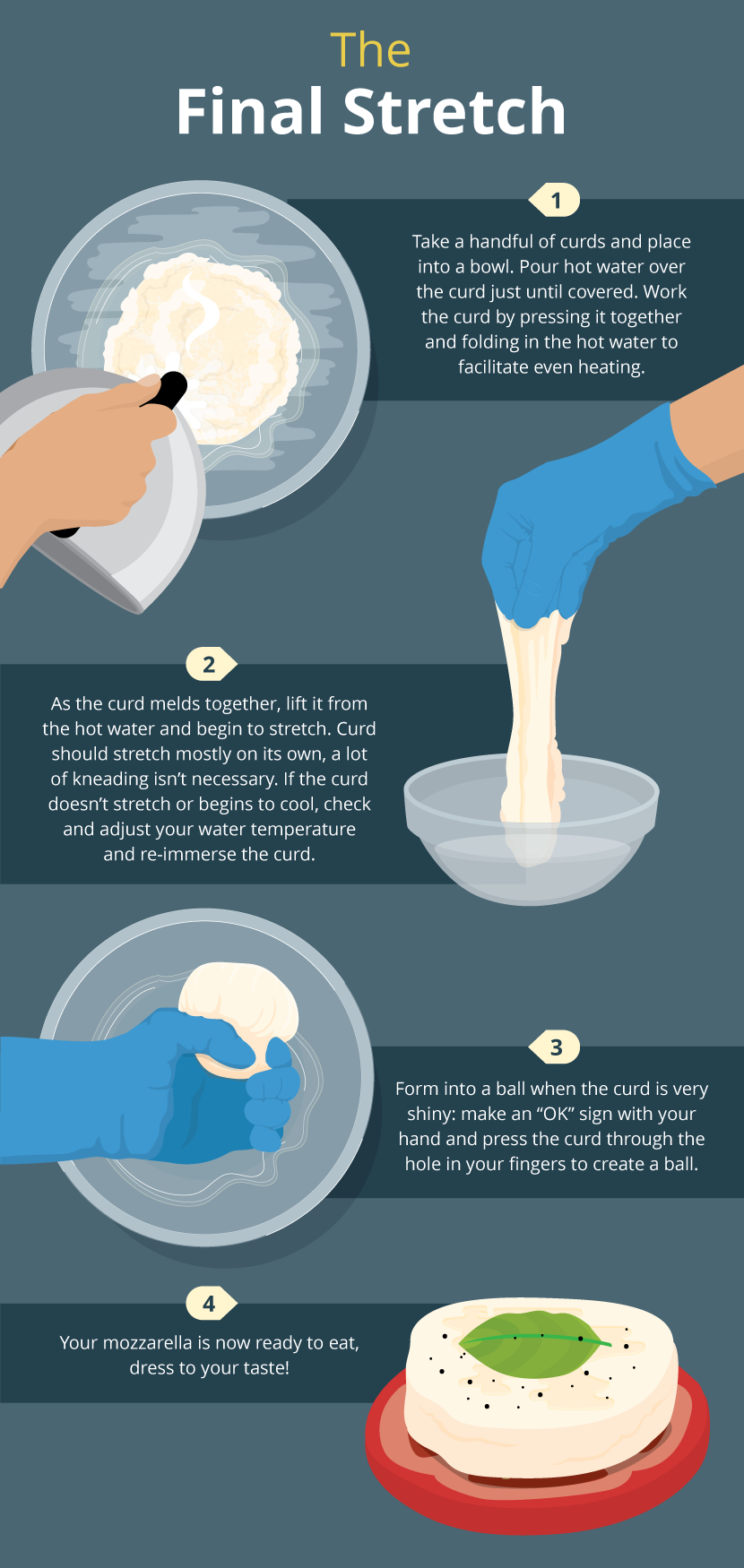 Curd should stretch mostly on its own – a lot of kneading isn’t necessary. If the curd does not stretch, check and adjust your water temperature and re-immerse the curd. If there continues to be stretching issues, it might be a milk problem.