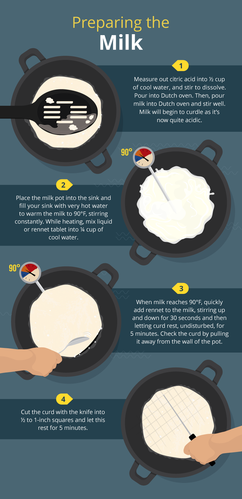 When milk reaches 90°F, quickly add rennet to the milk, stirring up and down for 30 seconds and then letting curd rest, undisturbed, for 5 minutes. After 5 minutes, check the curd by pulling it away from the wall of the pot, or check for “clean break” with a knife.