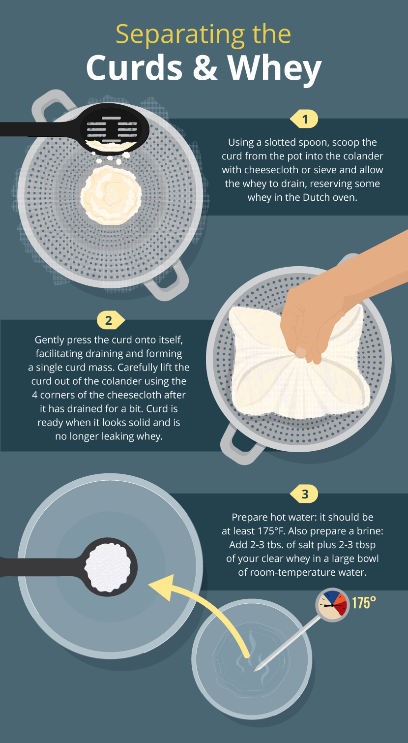 As the curd drains, prepare hot water: it should be at least 175°F. Also prepare a brine: Add 2-3 tbs. of salt plus 2-3 tbsp of your clear whey to a large bowl of room-temperature water.